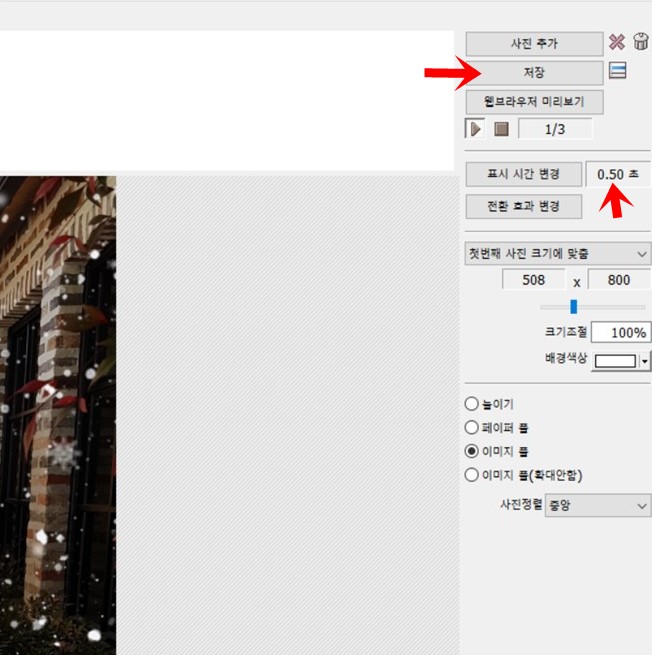 만일 시간 변경을 원하면 [표시 시간 변경]에서 조정한다. 사진 순서를 바꾸려면 마우스로 클릭한 채 이동하면 된다. 저장한다.