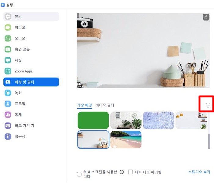 미리 PC/노트북에 준비한 사진을 + 눌러 가져온다. 그리고 가상 배경으로 선택한다.