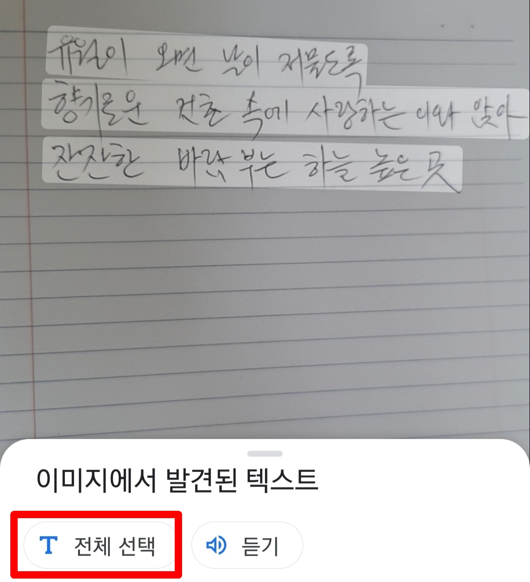 전체 선택을 한다. 옆의 듣기는 글을 읽어주는 기능이다.