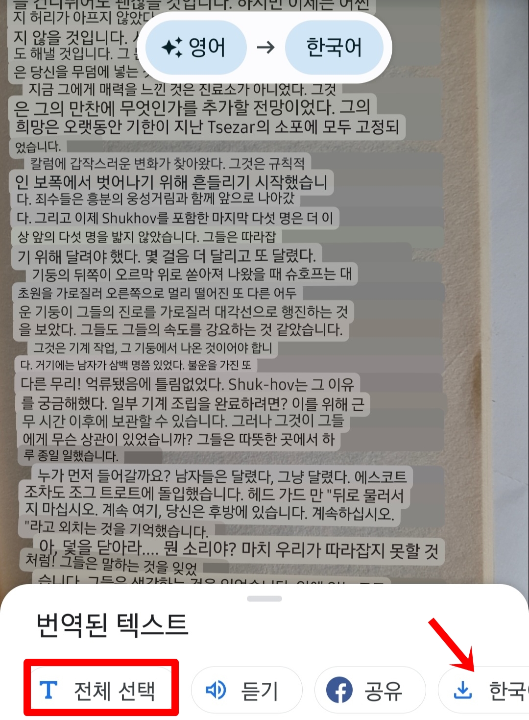 전체 선택을 누르면 텍스트 복사, 듣기 등 모두가 가능하다. 한국어 다운로드를 누르면 인터넷이 안되어도 번역이 가능하다.