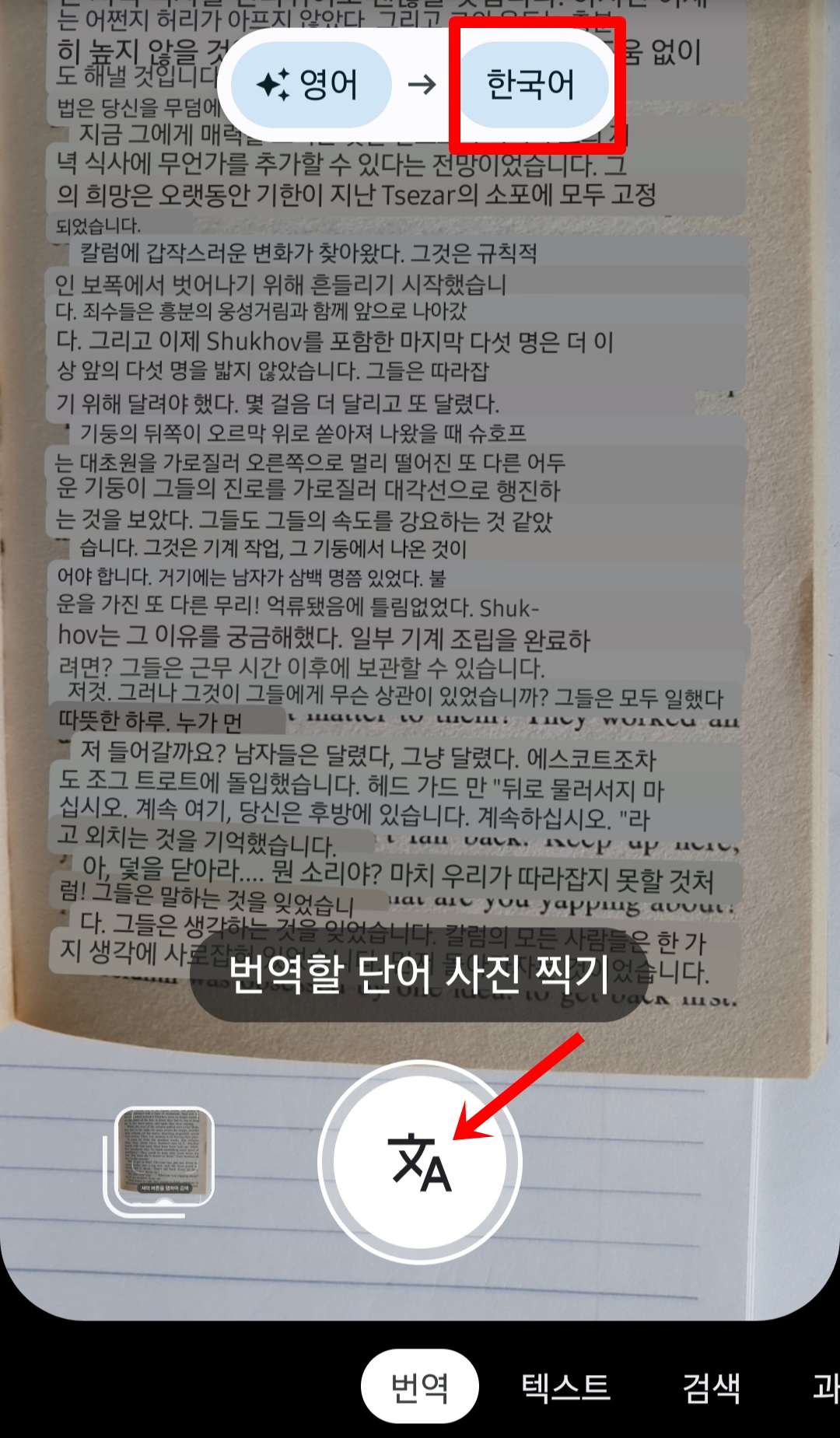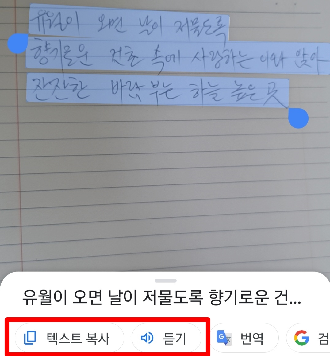 카메라로 검색을 터치하고 손으로 쓴 글씨를 비춘다. 텍스트를 선택하고 복사할 단어 사진 찍기를 한다.