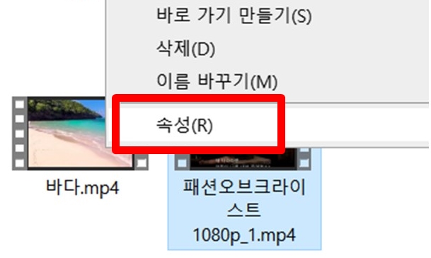 영상의 확장자는 영상의 속성을 보면 있다. 속성은 영상에 마우스를 대고 우측을 누르면 나온다.