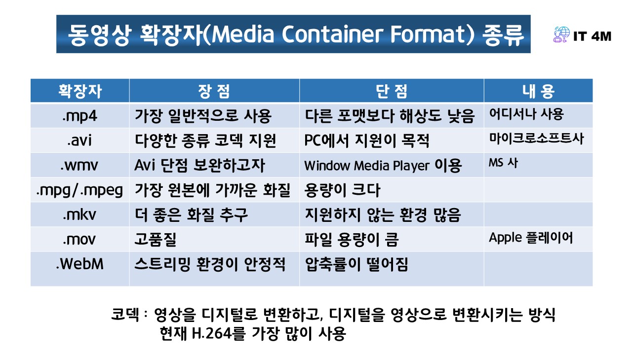 MOV나 WMV는 품질이 우수하나 용량이 크다. 별도 플레이어가 설치되야 볼 수 있다.